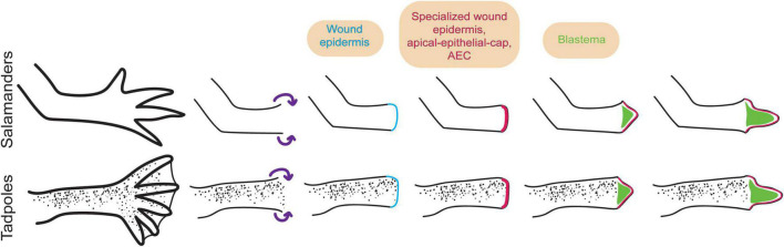 FIGURE 1. The wound epidermis (WE) and the specialized wound epidermis form in a step-wise manner during amphibian limb regeneration. Limb regeneration is initiated with amputation in (top) salamanders and (bottom) tadpoles. The remaining stump epidermal cells migrate to the amputation plane (purple arrows) and form the WE (light blue). Then the WE becomes the specialized wound epidermis [apical-epithelial-cap (AEC)] (dark pink) associated with regeneration (Christensen and Tassava, 2000). Afterward, the AEC leads to blastema formation and subsequent outgrowth (Tassava and Loyd, 1977). Although the presence of the AEC in early and mid-stages of regeneration is demonstrated by tissue morphology and staining assessments (e.g., Han et al., 2001), its presence in late stages is observed only with tissue morphology assessment.