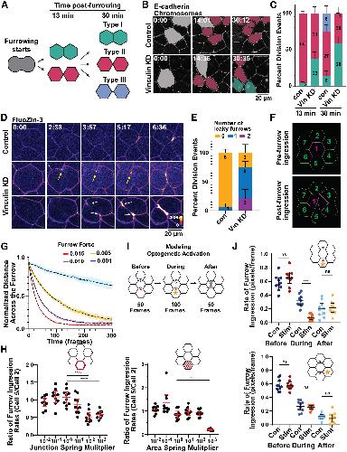 (B) Montage of control and vinculin KD embryos expressing E-cadherin-3×GFP and GFP-H2B (chromosome marker) showing cells before ingression (gray) and ∼14 and ∼30 min after ingression. Dividing cells are color coded for type I (green) and type II interfaces (magenta).