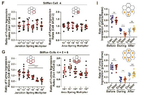 embryos. F) Ratio of furrow ingression rates with a single non-furrow neighbor (Cell 4) stiffened