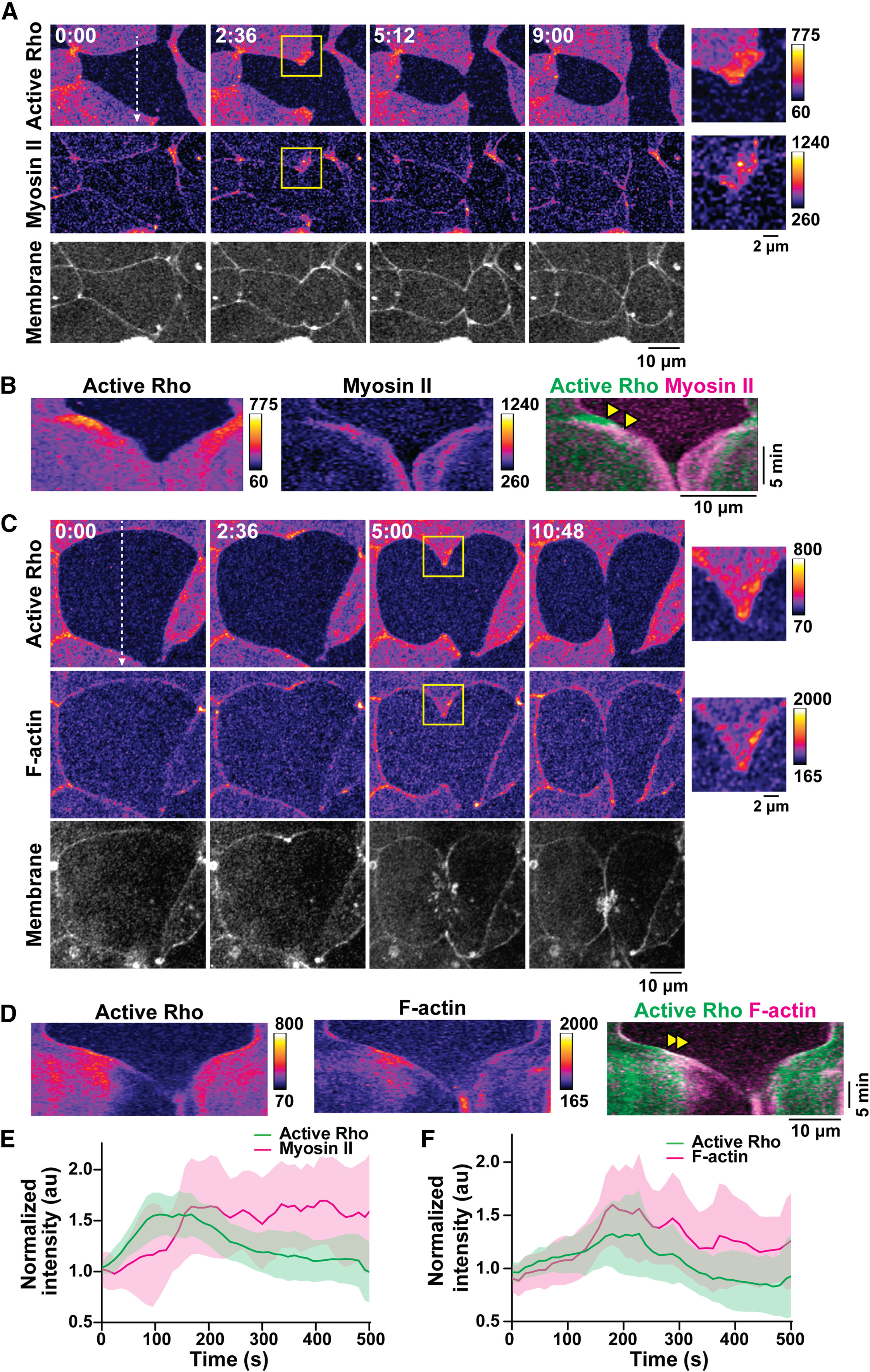 (D) Kymographs of active Rho and F-actin generated from the dashed line shown in (C). Yellow arrowheads indicate peak active Rho and F-actin intensity.