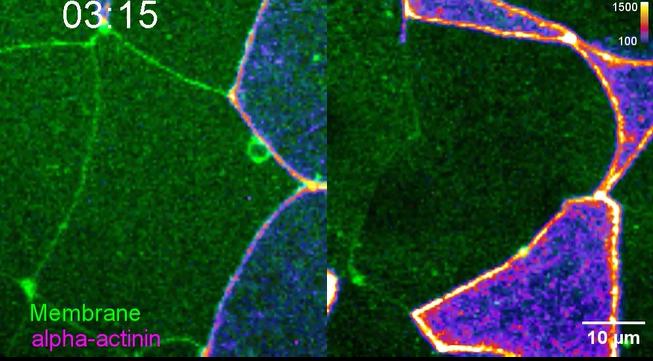 Video S3. ɑ-actinin overexpression in neighbor cells slows cytokinetic furrow ingression, related to Figure 2A. Time-lapse confocal imaging of GFP-ɑ-actinin (Fire lookup table) and cell membrane (CellMask Deep Red, green). Left: Dividing cell with one neighbor overexpressing ɑ-actinin at low level; Right: dividing cell with one neighbor overexpressing ɑ-actinin at high level. Lookup table scale is indicated as shown. Time shown in minutes:seconds. Playback at 10fps.