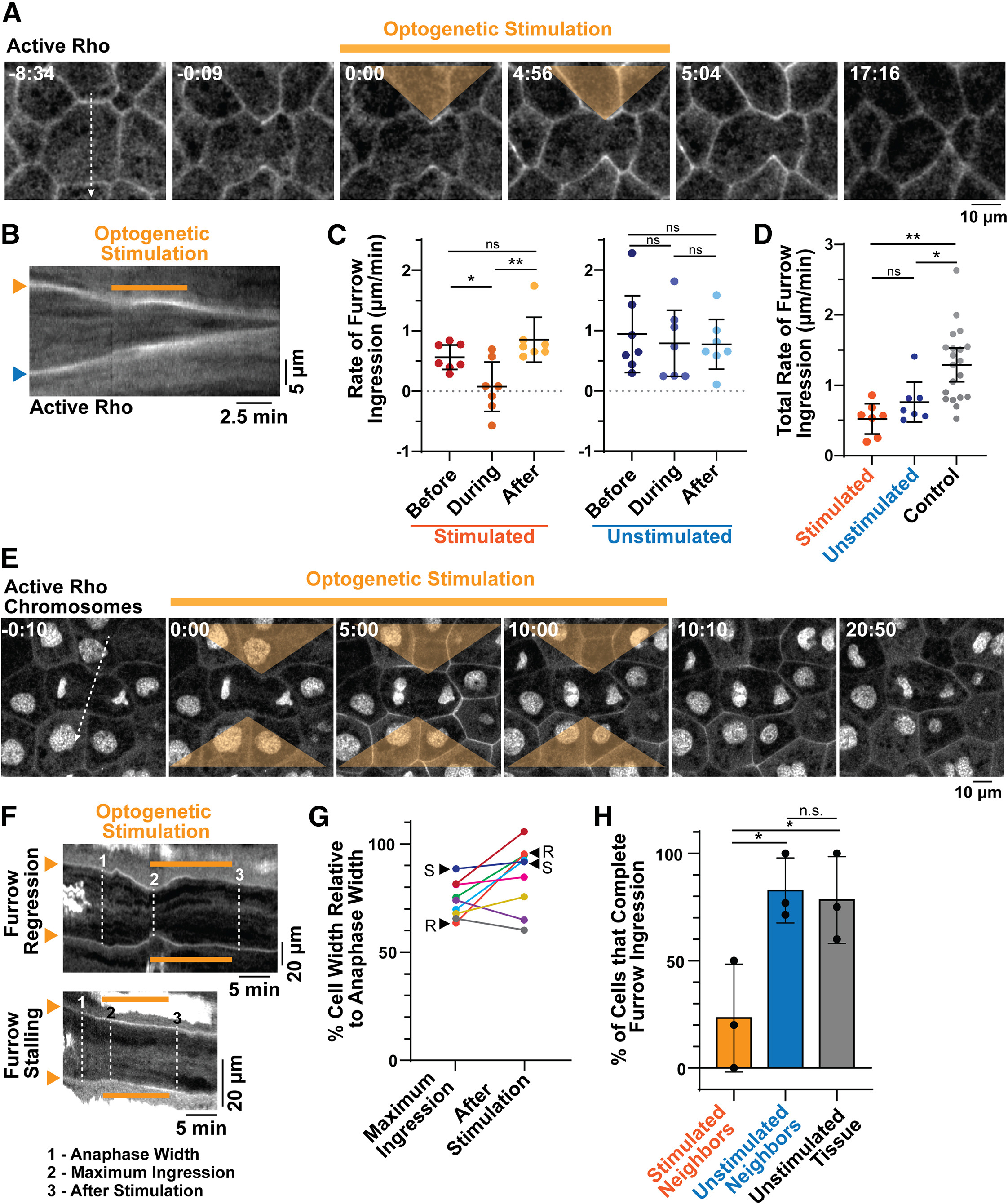 (F) Kymograph of furrow ingression with optogenetic stimulation of Rho in both neighbors. Examples of furrow regression (generated from the dashed line shown in E) and stalling are shown. Orange arrowheads and line indicate sides of the furrow with a stimulated neighbor and the duration of stimulation, respectively. Dashed lines illustrate time points used to measure cell width.