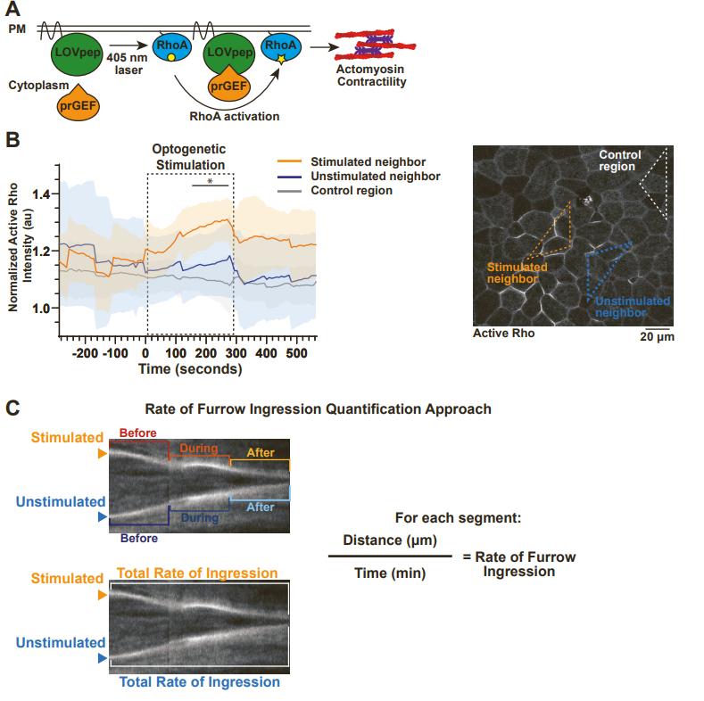 optogenetic activation of Rho-mediated actomyosin contractility. B) Left: Plot of active Rho