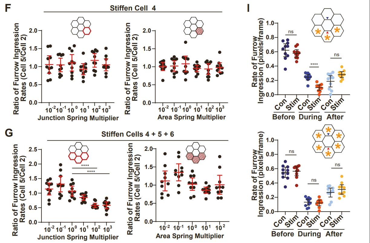 (H) Ratio of furrow ingression rates with a single neighbor (cell 5) stiffened with either a junction spring multiplier or an area spring multiplier. Mean ± 95% CI; n = 10 simulations for each condition. ∗∗∗∗p ≤ 0.0001.
