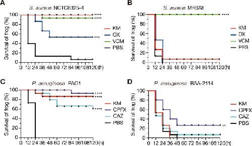 Fig 3. Antimicrobial agents inhibit bacterial infections in Xenopus frogs. Therapeutic effects of kanamycin (KM), oxacillin (OX), and vancomycin (VCM) on frogs injected with S. aureus NCTC8325-4 (A) and MRSA8 (B) were examined. Similarly, the effects of kanamycin (KM), ciprofloxacin (CPFX), and ceftazidime (CAZ) on frogs infected with P. aeruginosa PAO1 (C) and BAA-2114 (D) were examined. Immediately after intraperitoneal injection of bacterial suspensions, frogs were intraperitoneally administered with 50 µL of 2 mg/mL antimicrobial agent (100 µg/frog) or PBS, and survival was measured every 12 h. Five frogs were used per agent, and survival data were pooled from three independent experiments (n = 15). Significant differences between PBS- and antimicrobial-injected groups were determined using the log-rank test (**P < 0.01, ***P < 0.001, ****P < 0.0001).