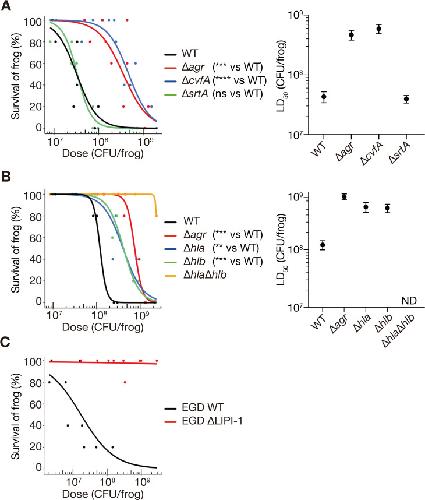 Fig 4. Deletion of bacterial virulence genes reduces bacterial killing activity against Xenopus frogs. (A) Comparison of the frog-killing abilities of S. aureus NCTC8325-4 strain (WT) and strains with deleted agr, srtA, and cvfA. (B) Comparison of the frog-killing abilities of NCTC8325-4 WT and strains with deleted agr, hla, hlb, and hla/hlb. (C) Comparison of the frog-killing ability of L. monocytogenes EGD (WT) and a strain with deleted LIPI-1. The data for L. monocytogenes EGD WT are the same as those presented in Fig. 2D. For all panels, bacterial suspensions were injected intraperitoneally into frogs, and survival was measured at 24 h post-injection. Five frogs were injected with each of three different concentrations of bacterial suspensions per strain in a single experiment. Dose-response survival curves were generated using logistic regression based on data from at least three independent experiments, and LD50 and standard error were calculated. Significant differences between gene-deleted and WT strains were determined using the likelihood ratio test (**: P < 0.01, ***: P < 0.001, ****: P < 0.0001). Error bars represent standard error.