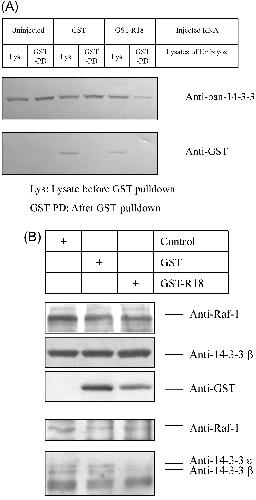 (B) The GST-R18 fusion protein inhibits the association of 14-3-3 with