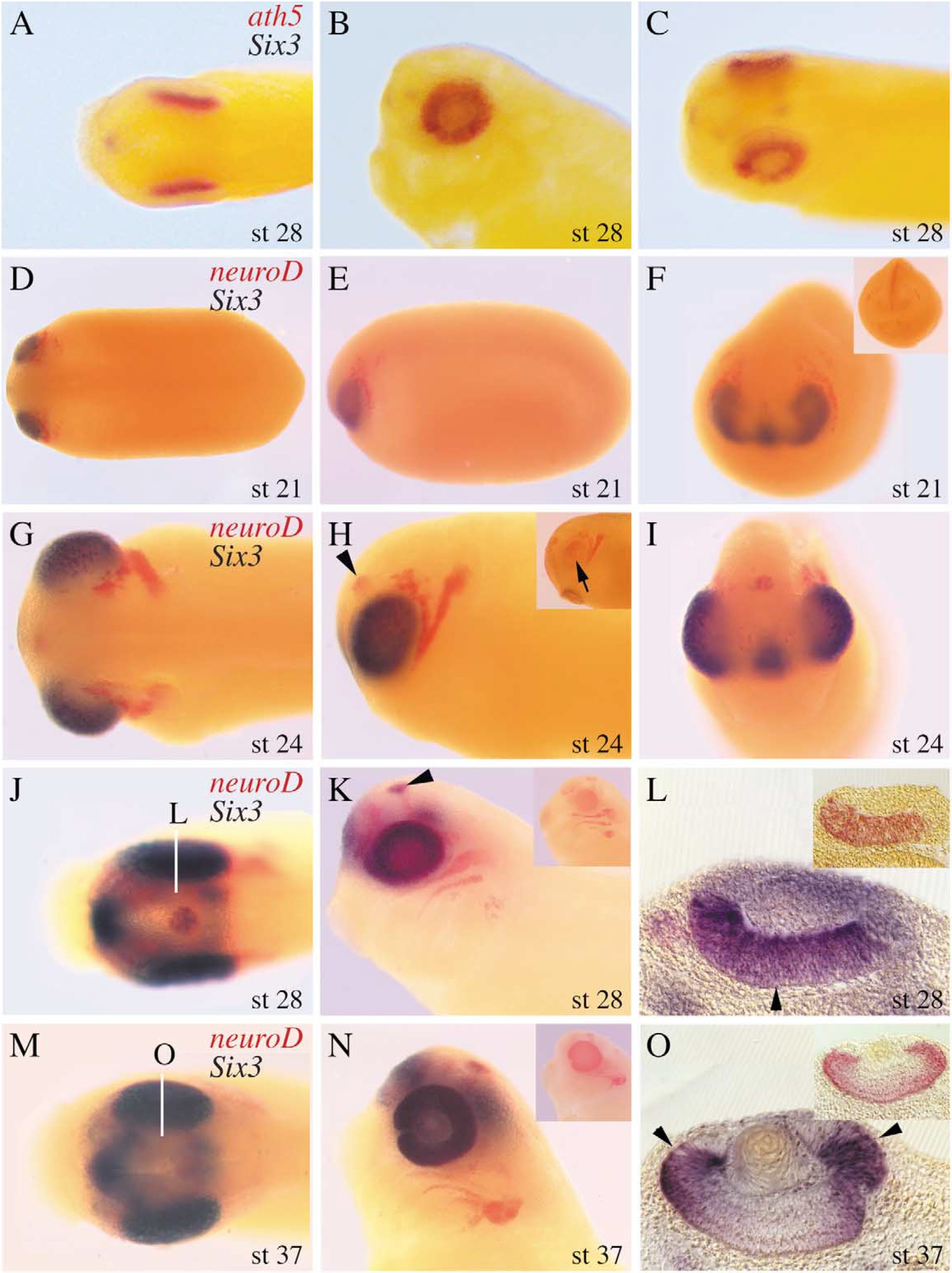 first detectable at stage 24. Note that at this stage only scattered individual cells express XNeuroD in a broad XSix3 domain (arrow in inset in H). In