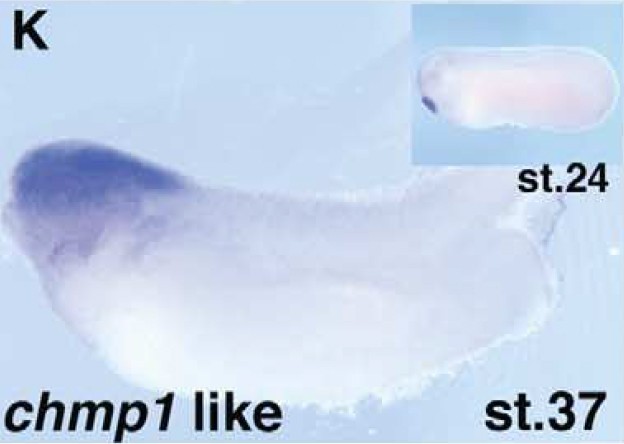 chmp1a (charged multivesicular body protein 1A) gene expression in Xenopus laevis embryos, NF stage 37 (stage 24 inset), as assayed by in situ hybridization. Lateral view: anterior left, dorsal up.