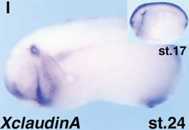cldn6.2 (claudin 6, gene 2) gene expression in Xenopus laevis embryos, NF stage 24 (stage 17 inset), as assayed by in situ hybridization. Lateral view: anterior left, dorsal up.