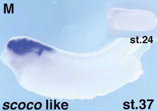 scoc (short coiled-coil protein) gene expression in Xenopus laevis embryos, NF stage 37 (stage 24 inset), as assayed by in situ hybridization, lateral view, anterior left, dorsal up.