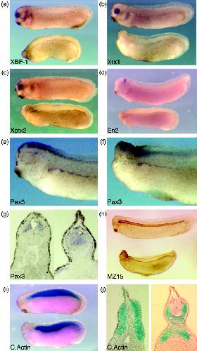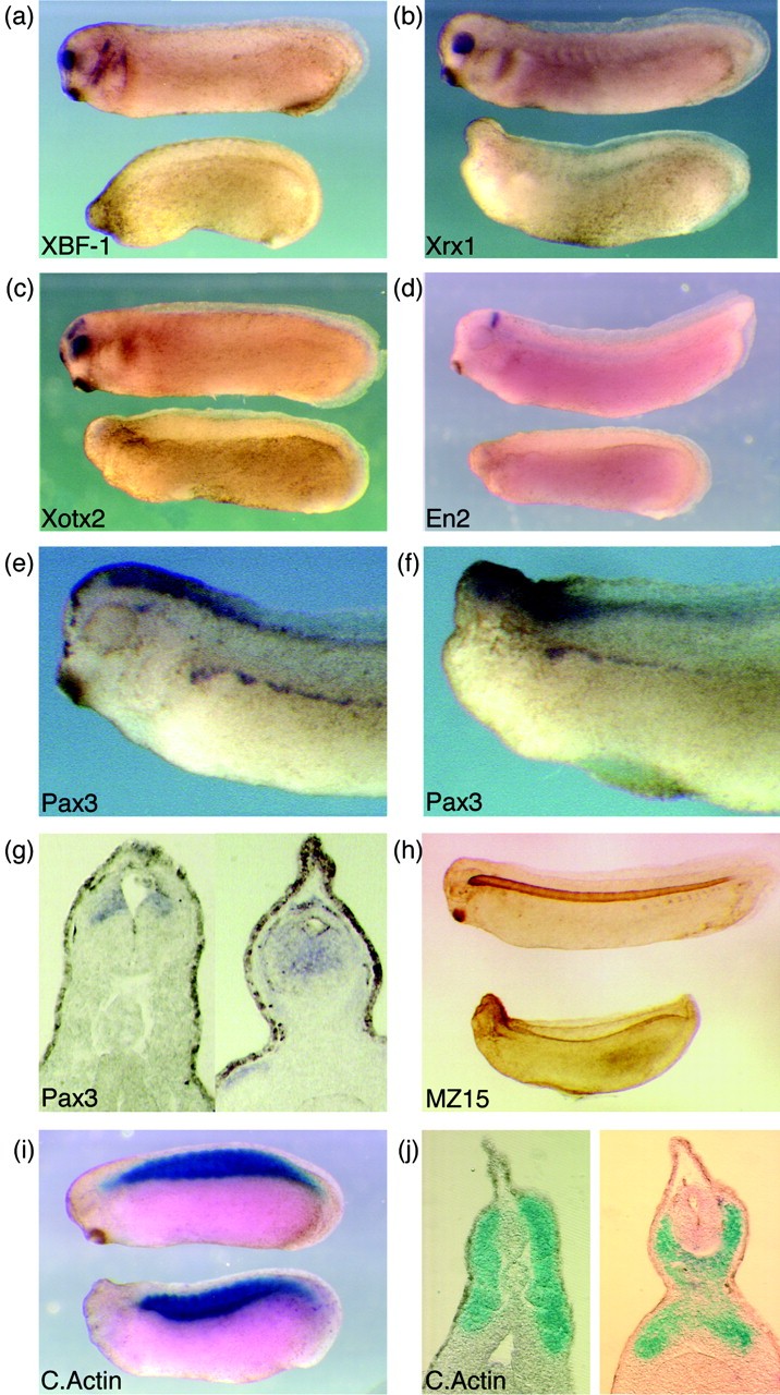 Figure 4 Analysis of the microcephalic phenotype at stage 3. F1 progeny from CMVGal4 line 1 Ã UASXvent-2 line 5. (aâf and i) In situ hybridization to the indicated marker genes. Representative sibling F1 embryos that are phenotypically normal (Upper) or microcephalic (Lower) are shown for each marker. (g and j) Transverse sections through the dorsal region of embryos stained for Pax-3 and cardiac actin, respectively, with the section of the microcephalic embryo on the right. (h) MZ15 monoclonal antibody staining of notochordal tissue for normal (Upper) and microcephalic (Lower) F1 embryos.
