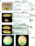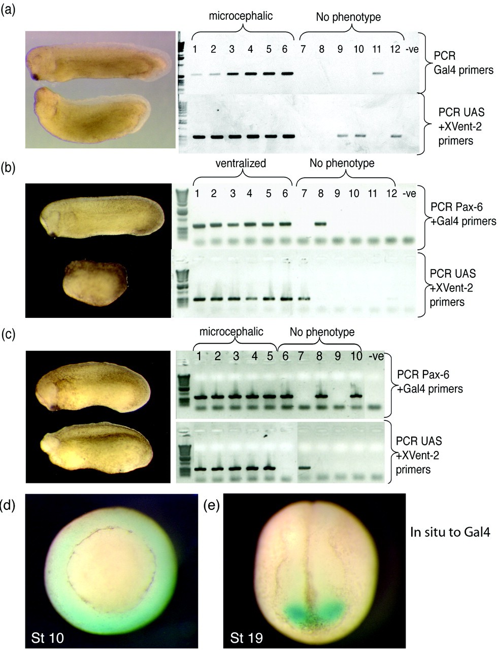 Figure 3 Microcephalic and ventralized phenotypes result from transactivation of Xvent-2 by Gal4 in three independent crosses. (a) CMVGal4 line 1 Ã UASXvent-2 line 5. (b) Pax-6Gal4 line 1 Ã UASXvent-2 line 4. (c) Pax-6Gal4 line 1 Ã UASXvent-2 line 6. (aâc Left) F1 stage 30 embryos showing the characteristic microcephalic or ventralized phenotype (Lower) when compared to an apparently normal sibling (Upper). (Right) PCR genotyping of individual embryos with the indicated phenotype. PCR primer combinations are indicated. âve, PCR control without DNA. (d and e) Half of F1 progeny from Pax-6Gal4 line 1 Ã wild type express Gal4 as revealed by in situ hybridization to Gal4 RNA. (d) At stage 10, Gal4 is expressed throughout the marginal zone of the embryo. (e) At stage 19, Gal4 expression is restricted to the eye field in the anterior neural plate.
