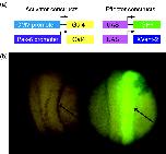 Figure 1 (a) Schematic diagram showing the activator and effector constructs used in this study. Activator constructs contain the yeast transcriptional activator Gal4 under the control of the ubiquitously expressed CMV promoter or the tissue-specific Pax-6 promoter. Effector constructs contain five repeat concatemers of the consensus binding site for Gal4 (UAS), linked to the hsp70 minimal promoter and the gene of interest, green fluorescent protein (GFP) or Xvent-2. (b) F1 progeny from effector lines were tested for the transmission of the transgene and transactivation by Gal4. Embryos were injected into one cell at the two-cell stage with 100 pg of Gal4 mRNA. Two stage 19 sibling F1 embryos from GUASGFP line 2 injected with Gal4 mRNA (arrow). GFP fluorescence is observed in the rightembryo on its right side, and that embryo is deemed to have inherited the UASGFP transgene, which has been transactivated by Gal4. The embryo on the left shows no GFP fluorescence and is assumed not to have inherited the transgene.