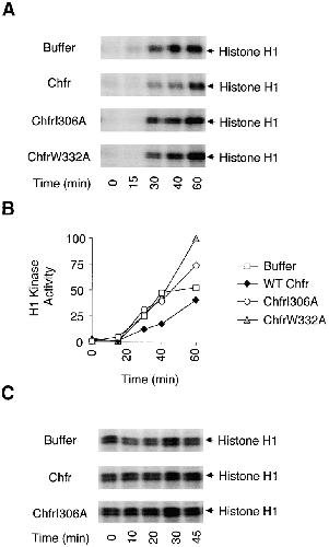 Figure 5. Chfr delays the activation of the Cdc2 kinase at the G2-M transition. (A and B) Xenopus interphase extracts were incubated with a buffer, Chfr, ChfrI306A, or ChfrW332A. Δ90 cyclin B was then added and the kinetics of the activation of the Cdc2 kinase was analyzed by measuring the phosphorylation of histone H1 with radioactive γ-ATP. The Cdc2 kinase activity was quantitated and plotted against time (B). The unit for kinase activity is arbitrary. In five separate experiments, the wild-type Chfr protein always delayed the activation of Cdc2 kinase. The levels of the Cdc2 activity at 60 min, from extracts treated with ChfrI306A and ChfrW332A, were slightly variable; in some experiments, these levels were close to, instead of higher than, that of the buffer control. (C) Xenopus mitotic extracts were incubated with a buffer, Chfr, or ChfrI306A, and the level of the Cdc2 kinase activity was analyzed using histone H1 as a substrate.