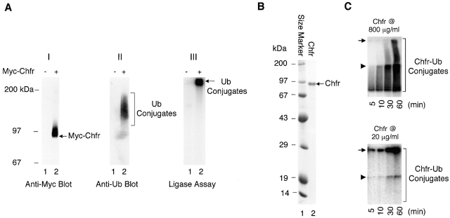Figure 1. Chfr is a ubiquitin ligase. (A) Myc–Chfr (lanes 2) and control vector (lanes 1) were transfected into HEK293T cells and immunoprecipitated by an anti-Myc antibody. The immunoprecipitates were analyzed by Western blotting with an anti-Myc antibody (panel I) or with an anti-ubiquitin antibody (panel II). In addition, immunoprecipitates were incubated with radioactive ubiquitin in the presence of recombinant E1 and Ubc4 and assayed for ubiquitin ligase activity (panel III). The molecular weight markers for panels I–III are labeled on the left side of panel I. (B) Purified recombinant Chfr protein assayed by 12% SDS-PAGE. (C) Recombinant Chfr, at indicated final concentrations, was incubated with radioactive ubiquitin in the presence of E1 and Ubc4. The kinetics of the formation of the Chfr–Ub conjugates was assayed by 12% reducing SDS-PAGE. The arrows point to the wells of the stacking gel and the arrowheads indicate the junction between stacking and separation gels.