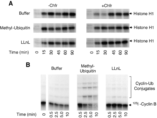 Figure 6. Chfr-mediated inhibition of Cdc2 requires ubiquitin-dependent protein degradation. (A) Xenopus interphase extracts were incubated with a buffer or Chfr in the presence or absence of methyl-ubiquitin and LLnL. Δ90 cyclin B was then added and the kinetics of the activation of the Cdc2 kinase was analyzed using histone H1 as a substrate. The exact kinetics of activation of Cdc2 in buffer control here are different from that in Fig. 5 due to variations between different extracts. (B) Methyl-ubiquitin and LLnL effectively inhibit ubiquitin-dependent proteolysis. Xenopus mitotic extracts were incubated with a buffer, methyl-ubiquitin, or LLnL. Radioactive cyclin B was then added and the kinetics of its degradation was analyzed by SDS-PAGE.