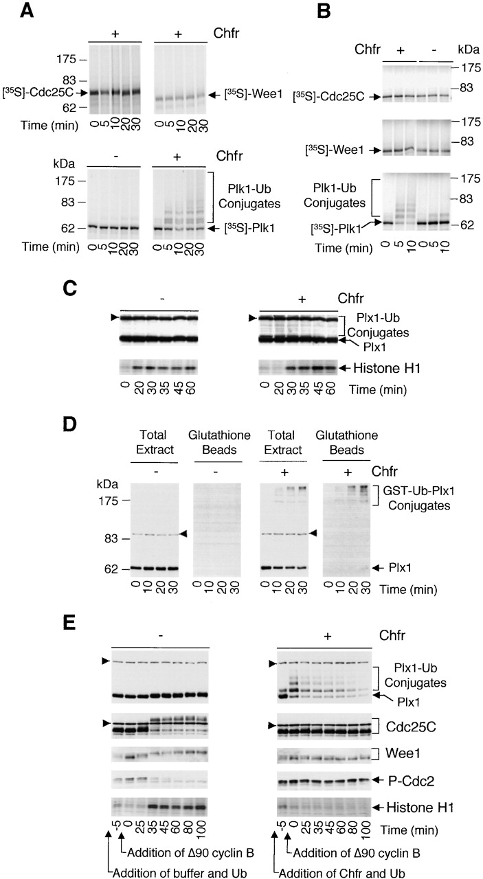 Figure 8. Plk1 is the substrate of Chfr ligase. (A) In vitro–translated Cdc25, Wee1, and Plk1 were incubated with Xenopus interphase extracts and ubiquitin, either in the presence or absence of recombinant Chfr, and the ubiquitination of these proteins was analyzed by SDS-PAGE. (B) In vitro–translated Cdc25, Wee1, and Plk1 were incubated with recombinant E1, E2, ubiquitin, and ATP, either in the presence or absence of recombinant Chfr, and the ubiquitination of these proteins was analyzed by SDS-PAGE. (C) Xenopus interphase extracts were incubated with a buffer or Chfr. Δ90 cyclin B was then added and the kinetics of the activation of the Cdc2 kinase was analyzed by measuring the phosphorylation of histone H1. Duplicated samples were analyzed in Western blot with an antibody against Xenopus Plx1. Arrowheads point to nonspecific, cross-reacting bands. (D) Xenopus interphase extracts were incubated with GST–Ub plus a buffer or Chfr. Samples were collected at various time points to directly blot against an anti-Plx1 antibody. In addition, GST–Ub conjugates were purified with glutathione beads and then assayed by Western blot analysis using the anti-Plx1 antibody. Arrowheads point to nonspecific, cross-reacting bands. (E) Xenopus interphase extracts were incubated with recombinant ubiquitin (at 2 mg/ml) plus a buffer or Chfr for 5 min. Δ90 cyclin B was then added and the kinetics of entry into mitosis was measured by the Cdc2 kinase activity and by the phosphorylation state of Cdc2, Cdc25C, and Wee1. The degree of ubiquitination of Plx1 was assayed by Western blotting with an anti-Plx1 antibody. Arrowheads point to nonspecific, cross-reacting bands.