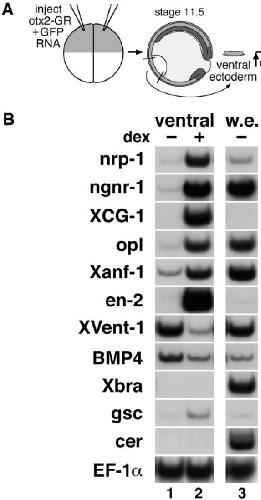 two-cell stage with 100 pg otx2-En or globin control RNA plus 60 pg lacZ RNA. Embryos were allowed to develop until early neurula (stage