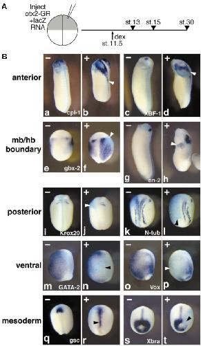 FIG. 1. otx2 activates anterior and represses posterior and ventral gene expression in whole embryos. (A) Albino embryos were injected in one cell at the two-cell stage with 100 pg otx2-GR RNA mixed with 60 pg lacZ RNA. Injected embryos were incubated without or with dexamethasone (dex) beginning at midgastrula (stage 11.5) and until early neurula (stage 13), midneurula (stage 15), or hatching (stage 30). (B) Gene expression in embryos injected with otx2-GR and incubated without (#1113230; or with (#1113090; dex was assayed by whole-mount in situ hybridization. Embryos are oriented with anterior at the top. Dorsal to the right: ad, g, h, m. Dorsal view: e, f, i, q. Arrowheads point to altered patterns of gene expression. otx2 activity at gastrula stages induced ectopic NCAM expression ventrally (Gammill and Sive, 2000) and expanded NCAM expression dorsally, often to the extent that the eye was no longer apparent on the injected side (data not shown). General neural markers N-tubulin (Richter et al., 1988) and nrp-1 (Knecht et al., 1995) behaved similarly (data not shown). Anterior neural: (a) lipocalin, st. 30, -dex; (b) lipocalin, st. 30, +dex; (c) XBF-1, st. 32, -dex; (d) XBF-1, st. 32, +dex. Mid/hindbrain boundary: (e) gbx-2, st. 13, -dex; (f) gbx-2, st. 13, +dex; (g) engrailed-2, st. 32, -dex; (h) engrailed-2, st. 32, +dex. Posterior neural: (i), Krox20, st. 16, -dex; (j) Krox20, st. 16, +dex; (k) N-tubulin, st. 15, -dex; (l) N-tubulin, st. 15, +dex. Ventral ectoderm: (m) GATA-2, st. 13, -dex; (n) GATA-2, st. 13, +dex; (o) Vox, st. 13, -dex; (p) Vox, st. 13, +dex. Mesoderm: (q) goosecoid, st. 13, -dex; (r) goosecoid, st. 13, +dex; (s) brachyury, st. 13, -dex; (t) brachyury, st. 13, +dex.