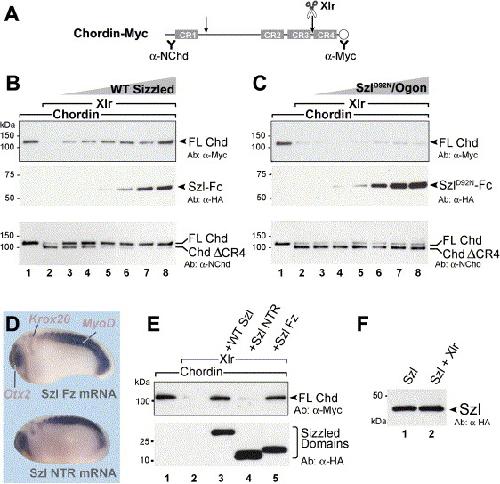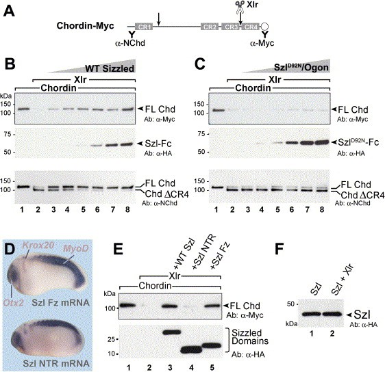 Figure 5. Sizzled, but not SzlD92N Mutant, Inhibits the Proteolytic Activity of Xlr on Its Natural Substrate Chordin(A) Diagram of Chordin protein structure and antibody recognition sites.(B) Specific proteolysis of Chd (20 nM) by Xlr enzyme can by inhibited by increasing concentrations of Szl-Fc (lanes 3â8, 4â100 nM).(C) Increasing concentrations of SzlD92N/Ogon-Fc do not inhibit Xlr activity.(D) Dorsalizing biological activity of Szl is caused by its frizzled domain, not the netrin domain.(E) Sizzled inhibits Xlr proteolysis of Chordin via its frizzled domain.(F) Sizzled is not digested by Xlr after 2 hr digestion with 2 nM Xlr enzyme.