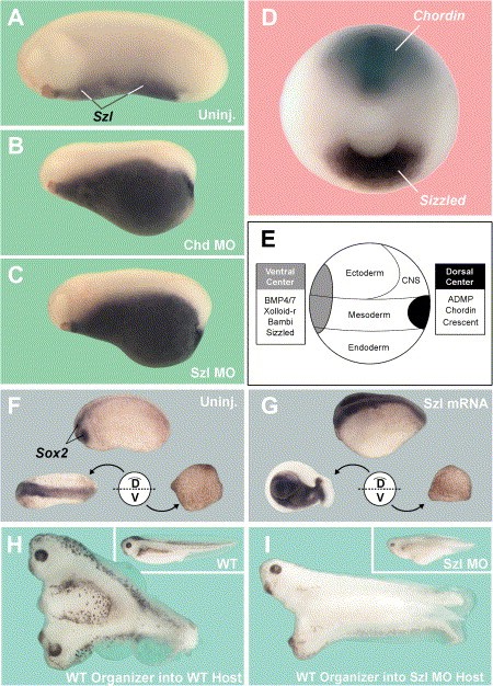 Figure 1. Sizzled Is Expressed Ventrally Yet Requires a Dorsal Component to Function(AâC) Szl-depleted embryo is ventralized, as marked by the accumulation of Szl ventro-posterior transcripts and phenocopies knockdown of Chd.(D) Chd and Szl are expressed at opposite poles of the Xenopus gastrula.(E) DV patterning is regulated via proteins secreted by the dorsal and ventral signaling centers.(F) Embryo bisected at blastula across the DV axis can self-regulate to form a well-proportioned dorsal-half embryo, while the ventral half forms a belly-piece. Sox2 marks the CNStissue. Uninjected wild-type embryo shown on top.(G) Injection of Szl mRNA increases Sox2 staining in intact (top) and dorsal-half embryos but is without phenotypic effect in the ventral-half embryo (n = 40).(H) A Spemann organizer transplant on the ventral side of a wild-type embryo forms a Y-shaped Siamese embryo with two heads and a single tailbud (n = 10).(I) Wild-type Spemann organizer grafted into a Szl-depleted host forms an H-shaped embryo with CNS induction and two distinct tailbuds (n = 11).