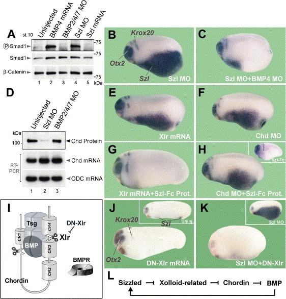 Figure 2. Sizzled Is a Feedback Inhibitor of BMP Signaling that Requires Xlr Activity(A) Endogenous Smad1 phosphorylation at early gastrula is increased by Szl MO.(B) An autoregulatory negative feedback loop is interrupted in Szl MO embryos, resulting in ventro-posterior accumulation of Szl transcripts.(C) Szl upregulation is mediated by BMP4 signaling.(D) Chd protein, but not Chd mRNA levels, are decreased by Szl knockdown (compare lanes 1 and 2). BMP2/4/7 MO injection serves as negative control.(E and F) Xlr mRNA overexpression or Chd knockdown increase ventralSzl transcripts, indicating increased BMP signaling.(G) Szl-Fc protein injection into the blastula cavity suppresses the pro-BMP effects of Xlr mRNA.(H) Szl-Fc protein has no effect in Chd-depleted embryos. Inset shows phenotype of Szl-Fc injection.(I) The role of Xlr in the regulation of Chordin anti-BMP activity. Tsg (Twisted gastrulation) is a cofactor of Chordin.(J) Microinjection of DN-Xlr mRNA expands Otx2 expression, a sign of dorsalization.(K) Szl MO feedback loop requires endogenous Xlr function since it is inhibited by DN-Xlr mRNA; compare with inset showing sibling embryo injected with Szl MO alone.All microinjection results were performed at least three times and minimum of 15 embryos were analyzed by hybridization in each sample.(L) Schematic diagram of the proposed BMP negative feedback loop via Sizzled, in which Szl inhibits Xlr activity.