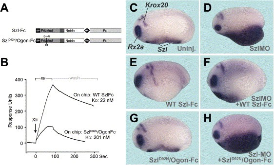 Figure 4. The SzlD92N Point Mutation Mimicking Zebrafish ogon Inhibits Xlr Binding and Biological Activity(A) Diagram of Szl-Fc and SzlD92N/Ogon-Fc constructs.(B) BIAcore measurements of binding of 10 μg/ml Xlr in the flow to wild-type Szl-Fc or SzlD92N/Ogon-Fc immobilized on the chip. Note the ten-fold decrease in binding affinity to Xlr.(CâH) Microinjection of 40 nl of 25 μM wild-type Szl-Fc protein into the blastula cavity dorsalizes the Xenopus embryo (E) and rescues the Szl knockdown phenotype (F). Injection of same concentration of SzlD92N/Ogon-Fc protein had no obvious phenotypic effect on wild-type (G) or Szl MO (H) embryos.