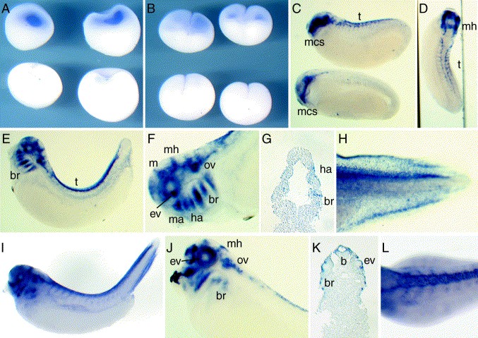 Dan is the founding member of the Dan family of secreted cytokines. All members of this family--which includes Gremlin, Cerberus, Dante, PRDC, and several genes identified as expressed sequence tags in the mouse--characterized to date have been shown to antagonize signaling by the bone morphogenetic protein (BMP) family. During mouse embryogenesis, Dan is expressed in a restricted and dynamic pattern. Major sites of transcription include the somites, the myotome and the cranial, and facial and limb mesenchyme. Xenopus Dan (XDan) shares over 76% amino acid identity with mouse Dan (mDan). Here we report that in Xenopus embryos, XDan is expressed both as a maternal transcript and at later stages in populations of cells associated with the cranial and trunk neural crest. The conservation of Dan expression in cells of the head mesenchyme between Xenopus and mouse embryos suggests an important role for BMP antagonists in these tissues.