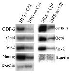 Fig. 1. GDF3 is specifically expressed in the undifferentiated state of embryonic stem cells. (Left panel) RT-PCR of GDF3 expression levels in H1 human embryonic stem cells (HES) in the continued presence (CM) and absence (no CM) of conditioned media for 7 days. (Right panel) GDF3 RT-PCR in 129Ola mouse ES cells in the presence or absence of LIF for 3 days. OCT4, SOX2 and NANOG are markers of pluripotency. β-actin is shown as a loading control; no RT control showed no signal.