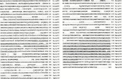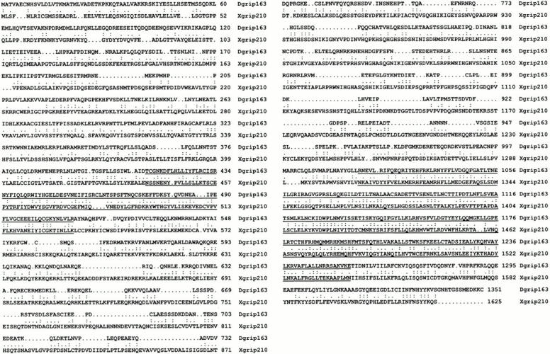 Figure 1. Xgrip210 defines a new family of grips of γTuRC. Sequence comparison of Xgrip210 and Dgrip163. The two sequences share over 20% amino acid identity. Double dots indicate identical amino acids, and single dot denotes the conserved changes. The sequences corresponding to grip motifs 1 and 2 found in the amino and carboxyl half of the proteins, respectively, are underlined.