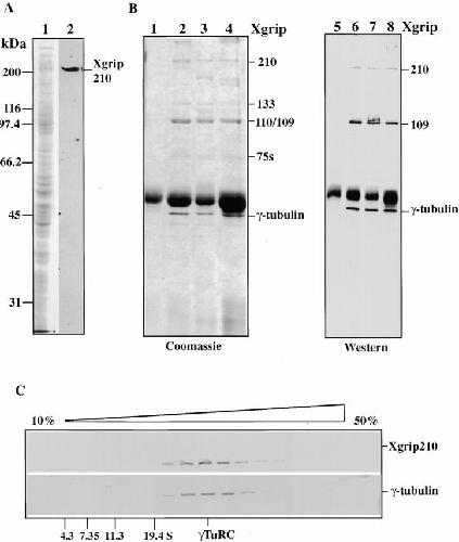 Figure 2. Xgrip210 is a component of Xenopus γTuRC. (A) Crude Xenopus egg extracts were analyzed by Coomassie blue staining (1) or by Western blot, probing with anti–Xgrip210 antibodies (2). The antibodies specifically recognized a protein of the expected size for Xgrip210. (B) Random rabbit IgG (1 and 5) and antibodies against Xgrips210 (2 and 6) or 109 (3 and 7) or γ-tubulin (4 and 8) were used to immunoprecipitate the respective proteins from Xenopus egg extracts. The immunoprecipitates were analyzed by SDS-PAGE followed by Coomassie blue staining (1–4) or Western blot, probing with each of these antibodies (5–8). All three antibodies immunoprecipitated the same γTuRC subunits. Although the Xgrip210 antibody specifically recognized Xgrip210 in the egg extracts (A, 2), the antibody recognized several high molecular weight proteins in the Xgrip210 immunoprecipitate (B, 8). The nature of these cross-reactive proteins is currently unknown. (C) Clarified Xenopus egg extract or protein standards with S values of 4.3 S (bovine serum albumin), 7.35 S (rabbit muscle aldolase), 11.3 S (bovine liver catalase), and 19.4 S (porcine thyroglobulin) were run on parallel 10–50% sucrose gradients. The fractions were analyzed by Western blot, probing for γ-tubulin or Xgrip210 or by Coomassie blue staining for the protein standards.
