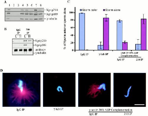Figure 5. Immunodepletion of Xgrip210 inhibits sperm centrosome formation. (A) Western blot analysis of immunodepleted egg extracts and 30% ammonium sulfate fractions. Xenopus egg extract immunodepleted with either random IgG (1) or antibodies against Xenopus γ-tubulin (2). 30% ammonium sulfate supernatant (3) and pellet (4). 30% ammonium sulfate pellet (30% ASP) resuspended in Hepes 1M and immunodepleted with either random IgG (5) or antibodies against Xgrip210 (6). 7 and 8 are the same as 5 and 6, respectively, except that the proteins were desalted into Hepes 100 and concentrated ∼10-fold. (B) Immunoprecipitates of random IgG (IgG IP) and Xgrip210 antibody (210 IP) from high (H) or low (L) salt-treated 30% ASP were analyzed by Western blot, probing with antibodies against Xgrips210 or 109, or γ-tubulin. Xgrip210 antibody did not immunoprecipitate significant amounts of Xgrip109 or γ-tubulin in high salt conditions. (C) The blue and red columns represent the percentages of sperm with or without associated MT asters, respectively. Immunodepletion of the egg extract with random IgG did not inhibit the formation of sperm centrosomes (IgG IP). The inhibition of sperm aster formation by immunodepleting γ-tubulin (γ-tub IP) was relieved by complementing with the 30% ASP that was depleted with random IgG (IgG IP), but not by the 30% ASP that was depleted with antibodies against Xgrip210 (210 IP). Error bars represent standard deviations calculated from three independent experiments. (D) Representative sperm nuclei with or without a MT aster from the assays in C are shown. Scale bar: 20 μm. The MTs were labeled by inclusion of a small amount of rhodamine-tubulin in the assays, and the sperm DNA was stained with DAPI.