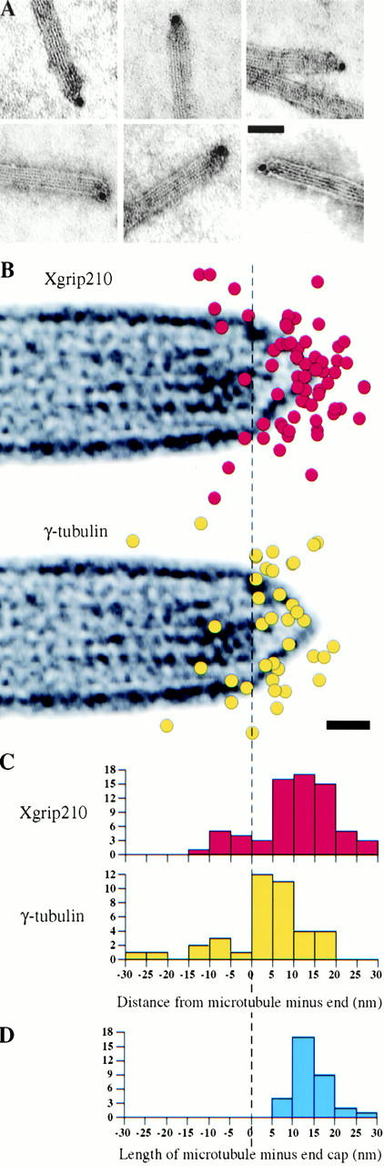 Figure 4. Immunogold localization of Xgrip210. (A) Examples of MTs with single 10-nm anti–Xgrip210 gold particles at the MT ends capped by γTuRC. In all cases shown, the center of the gold particle was within 15 nm of the tip of the end cap. Scale bar: 50 nm. (B) Distribution of anti–Xgrip210 or anti–γ-tubulin gold particles superimposed on an image of a typical γTuRC-capped MT end. Scale bar: 10 nm. (C) Distance distribution of the gold particles to the base of the MT lattice (dashed line), measured along the long axis of the MTs (red, Xgrip210; yellow, γ-tubulin). The average distance of the anti–Xgrip210 and anti–γ-tubulin gold particles from the base of the MT end are 10.4 ± 8.8 nm (n = 69) for Xgrip210 and 3.7 ± 9.9 nm (n = 39; Keating and Borisy 2000) for γ-tubulin. (D) Distribution of lengths of the microtubule end cap measured from the end of the microtubule lattice (B, dashed line) to the tip, from a representative sample of microtubules. The average length of the cap was 14.3 ± 3.7 nm (n = 33).