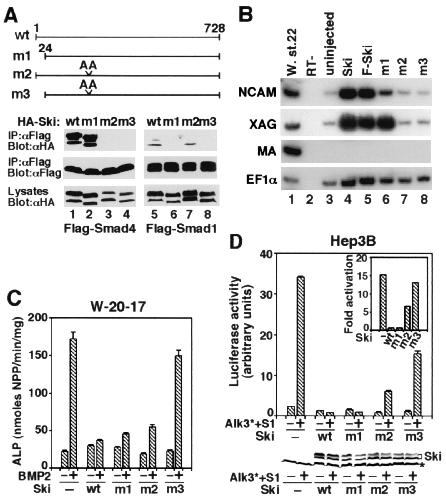 Figure 5 Interactions between Ski and the Smads are required for repression of BMP signaling by Ski. (A) Interaction between mutant Ski proteins and the Smads. (Upper) Schematic drawings of the Ski mutants are shown. (Lower) HA-tagged, wild-type, or mutant Ski proteins were cotransfected into 293T cells together with Flag-tagged Smad1 or Smad4 as indicated. The Smad-bound Ski proteins were isolated by immunoprecipitation with anti-Flag M2 mAb and detected by Western blotting with an anti-HA mAb. Cell lysates were blotted directly as a control for HA-Ski expression. (B) Mutant analysis in Xenopus ectoderm. Explants were harvested at stage 22 and assayed for NCAM, XAG, and muscle actin expression. Lanes 1 and 2, whole embryo and no RT (RTâ) control; lane 3, uninjected sample; lanes 4 and 5, explants expressing 500 pg of wild-type ski mRNA; lanes 6â8, explants expressing 500 pg of mRNA of ski mutants m1, m2, or m3. (C) To test the ability of the Ski mutants to repress BMP-induced ALP activity, various ski mutants were transfected into W-20-17 cells. ALP activity was assayed as described in Materials and Methods. (D). Hep3B cells were cotransfected with 0.75 μg of 15xGCCG-Luc, 0.5 μg of constitutive active BMPRI (Alk3*), 0.75 μg of HA-tagged, wild-type, or mutant ski, and 0.15 μg of Smads. Luciferase activity was measured 48 h later. (Lower) The levels of Ski proteins present in the transfected cells were detected by Western blotting with the anti-HA antibody. * indicates a nonspecific background band.