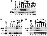 Figure 2 Ski antagonizes BMP signaling in Xenopus explants. (A) Ski blocks BMP2 activity. Explants were cultured until stage 10.5 and analyzed for Xbra expression by RT-PCR. Lanes 1 and 2, whole embryo control and no RT (RTâ); lane 3, uninjected explants; lanes 4 and 5, explants expressing AB2; lanes 6â8, explants expressing AB2 with increasing amounts of ski mRNA; lanes 9â11, explants expressing ski mRNA only. (B) Ski fails to neuralize in the presence of high levels of the constitutive active BMPRI (Alk3*). Explants were analyzed at stage 20 for NCAM expression. Lanes 3â5, explants expressing AB2 mRNA only; lane 6â8, explants expressing ski and increasing amounts of Alk3* as indicated. Alk3*, (Q233D)Alk3. (C) Ski blocks the activity of Smad1. Lane 3, uninjected sample; lane 4, Smad1 stimulates the expression of the ventral markers, Xvex-1 and Xhox-3; lanes 5â7, explants expressing Smad1 mRNA in combination with increasing amounts of ski mRNA; Lane 8, ski alone.